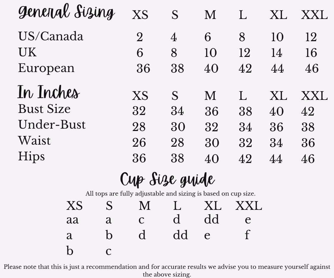 Size S bottoms and S top. She wears a D cup and a UK size 6/8.